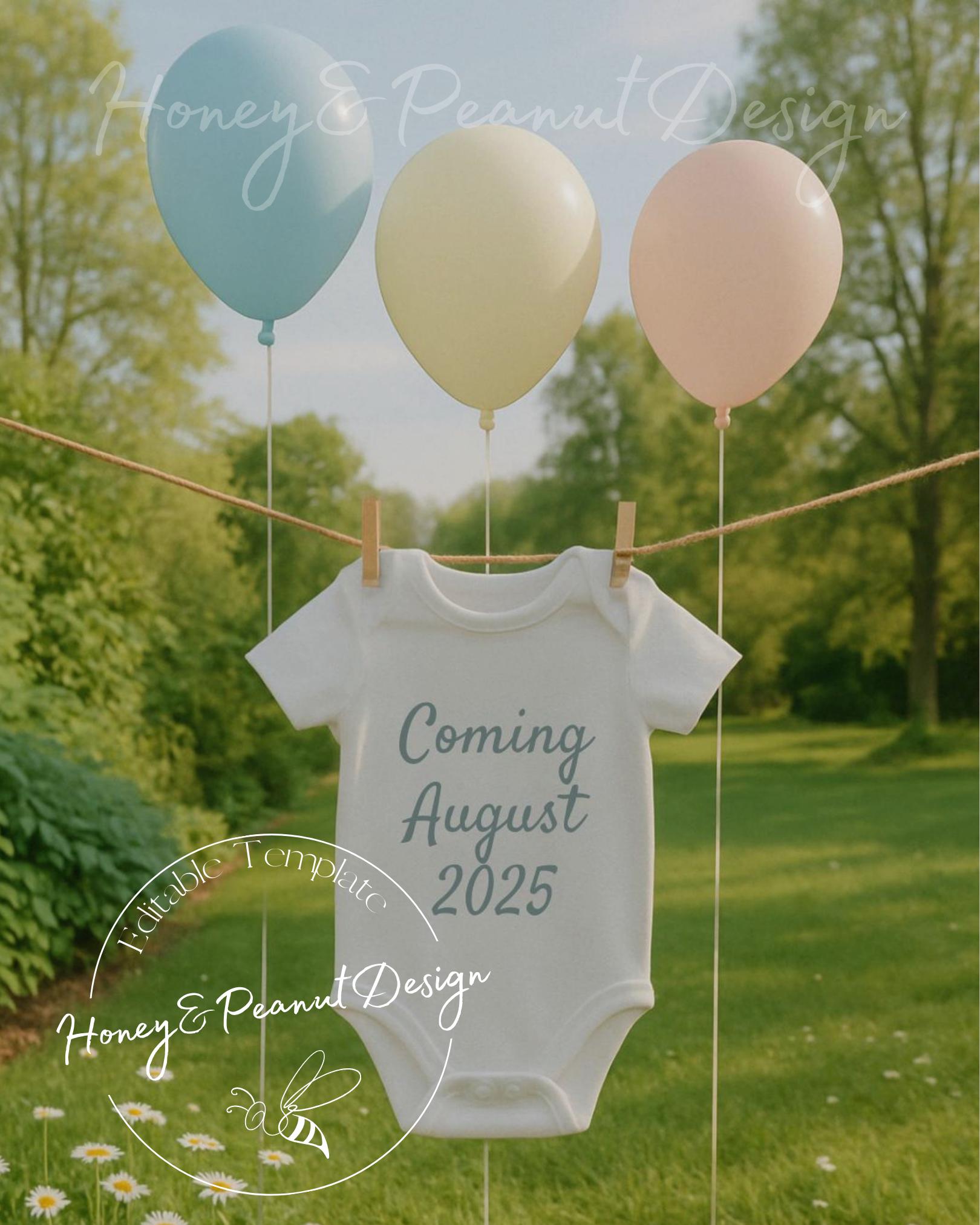 Announce your big news with the light and joy of a summer breeze! The Balloon Pop pregnancy announcement is a fresh and whimsical digital template that’s perfect for sharing the upcoming arrival of your little one. Set in a sunny field with pastel balloons and a hanging onesie, it’s a playful and heartwarming way to spread the joy.