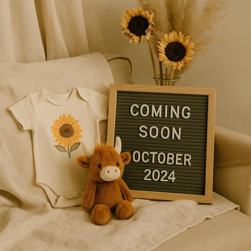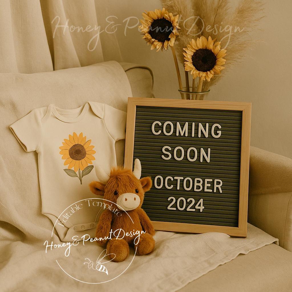 Announce your glowing news with “Sun-Kissed Arrival,” a cozy, boho-inspired Canva template made for warm hearts and sunflower dreams. Styled with love, this flat-lay design features a soft yellow blanket, dried sunflowers, a sweet neutral-toned onesie, and a single cuddly Highland cow plush—all wrapped in earthy textures and golden tones. At the center, a minimalist letterboard offers space for your personalized message, perfect for sharing your joy in the most heartfelt way.