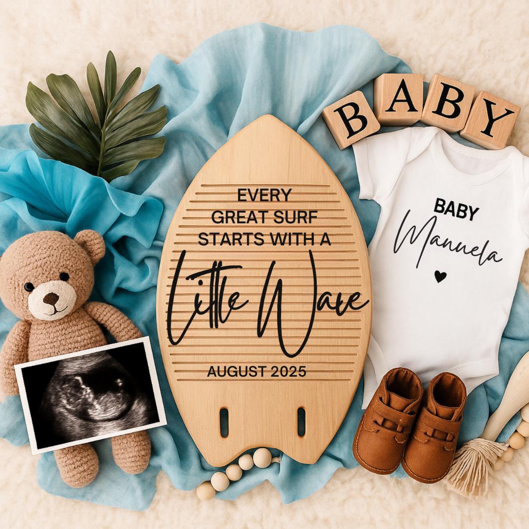 Make a splash with your announcement and ride the wave into parenthood with Our Tiny Surfer! 🌴👶🌊