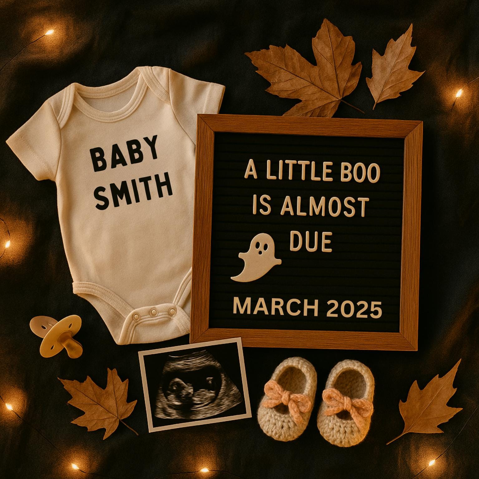 Celebrate your growing family this spooky season with our adorable "A Little Boo Is Brewing" pregnancy announcement! Perfect for fall-loving parents-to-be, this Halloween-themed flat lay features cozy black textures, playful ghosts, mini pumpkins, and a custom onesie with your baby's name – all artfully arranged to capture that sweet and spooky moment.