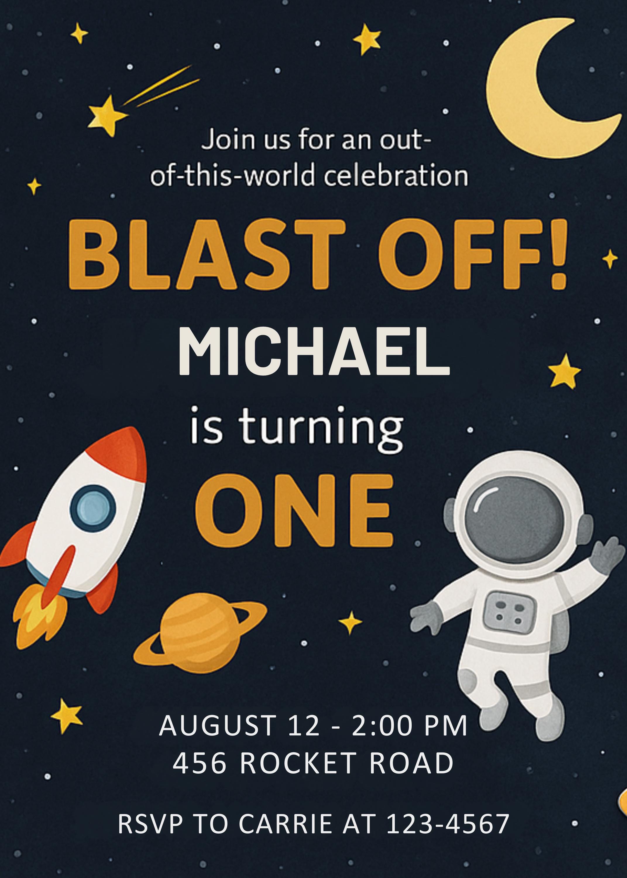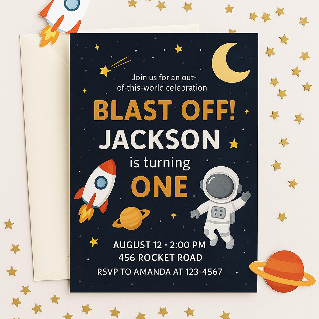Make your little one’s first birthday truly out of this world with this adorable Space-Themed Birthday Invitation! Featuring rockets, astronauts, planets, and a starry galaxy background, this invitation is perfect for any space-loving kiddo’s celebration.