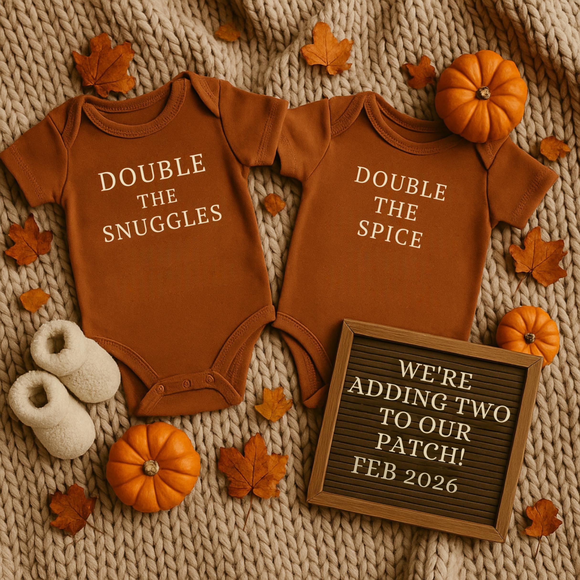 Celebrate your exciting news with this cozy and festive twin pregnancy announcement! Perfect for sharing with friends and family on social media, this autumn-themed flat lay features warm fall tones, pumpkins, leaves, and adorable matching onesies that say “Double the Snuggles” and “Double the Spice.”