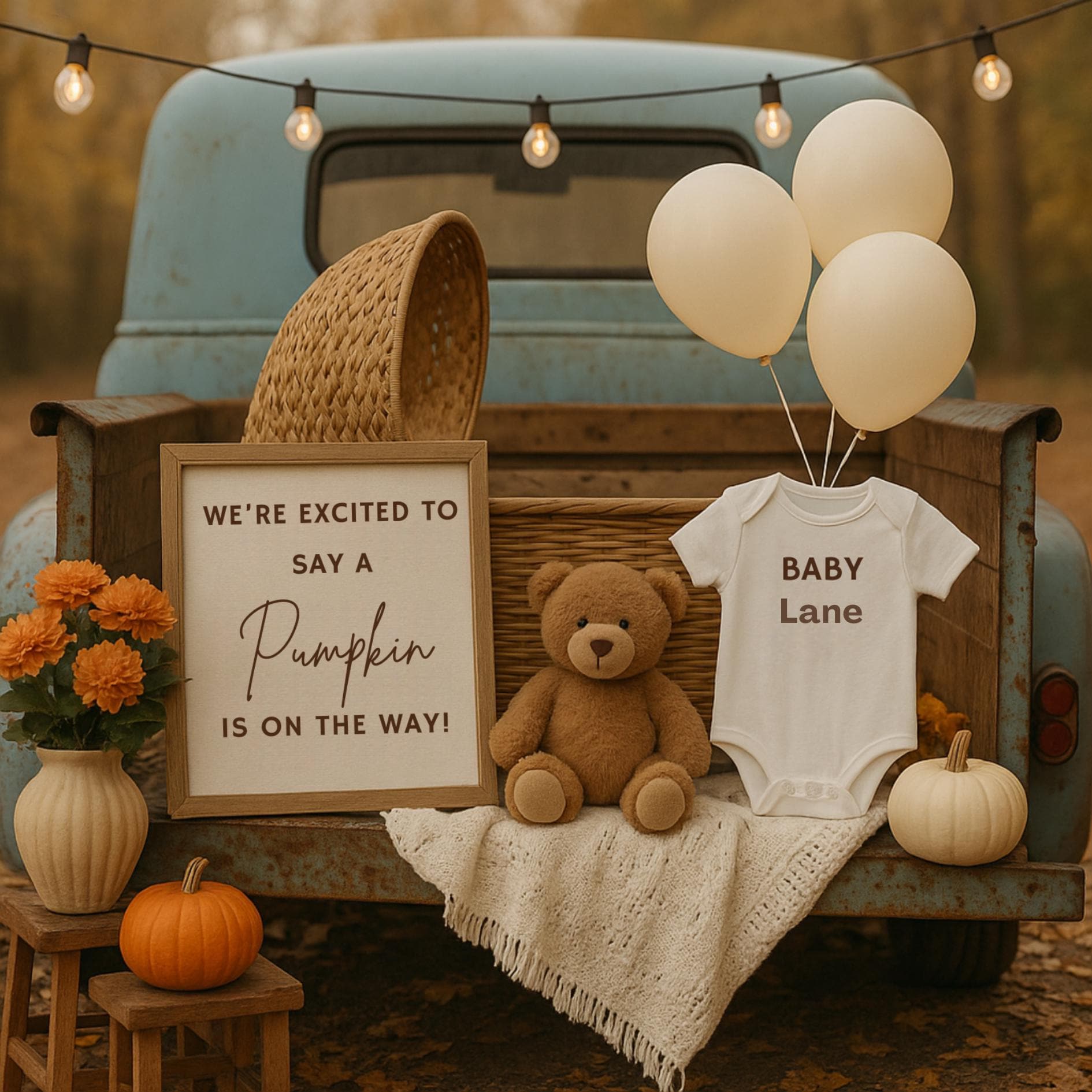 Share your joyful news with rustic fall charm! The āRustic Pumpkinā Pregnancy Announcement Template is the perfect way to reveal your little oneās arrival in style. With a vintage truck backdrop, glowing string lights, cozy blanket, pumpkins, and a sweet teddy bear, this design brings the warmth of autumn straight into your announcement.