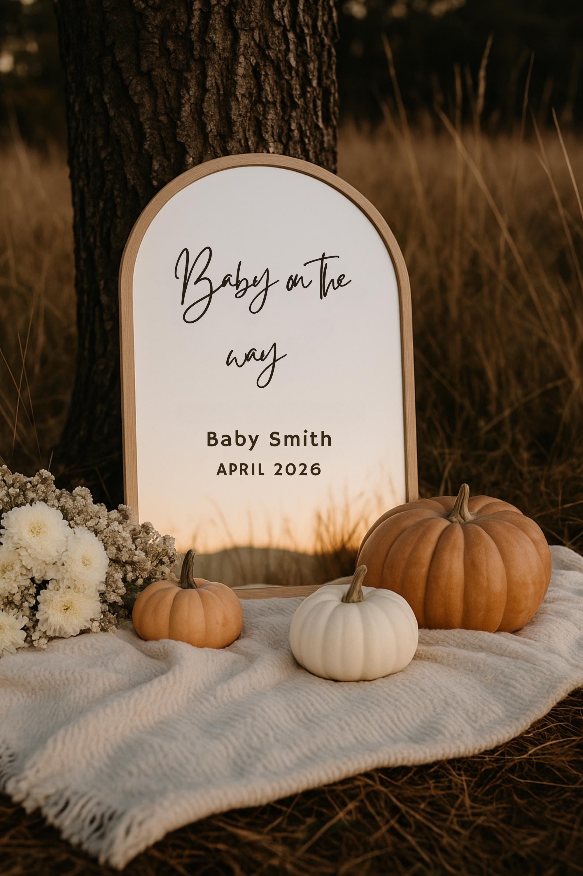 Celebrate your exciting news with the magic of autumn! The “Whimsical Fall Air” Pregnancy Announcement Template features a cozy fall setting with an arched sign, soft neutral pumpkins, seasonal florals, and a warm rustic backdrop. Minimal yet enchanting, this design creates a timeless and heartfelt way to announce your little one’s arrival.