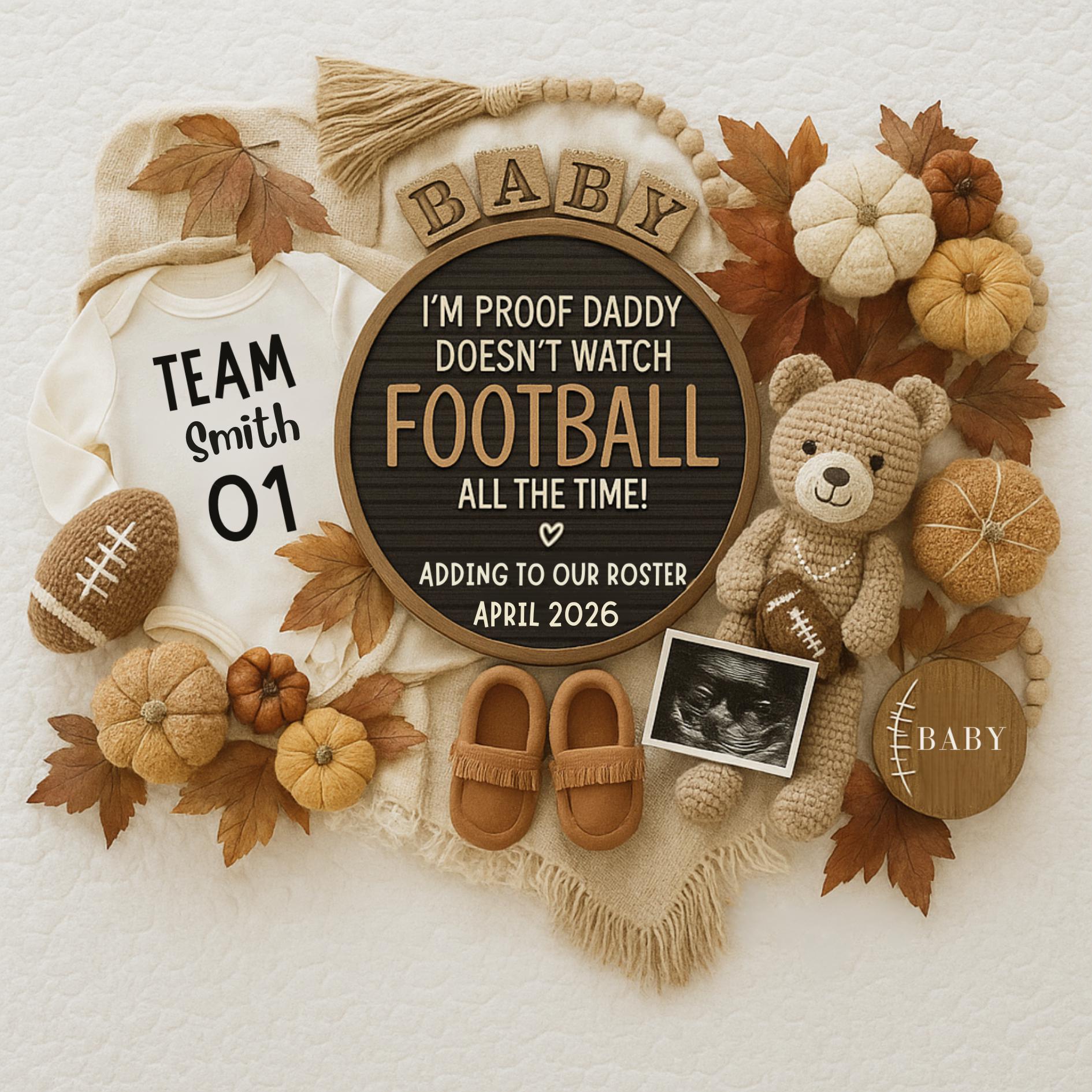 Get ready to kick off your biggest announcement yet! This cozy and adorable “MVP Coming Soon” pregnancy reveal is perfect for fall-loving, football-obsessed families. Featuring warm autumn tones, baby items, football accents, and a letter board message, this Honey and Peanut original sets the stage for a charming, sporty reveal that’s sure to score big with friends and family.