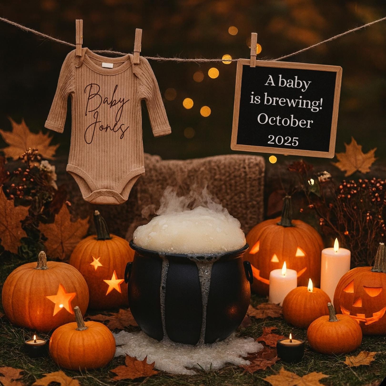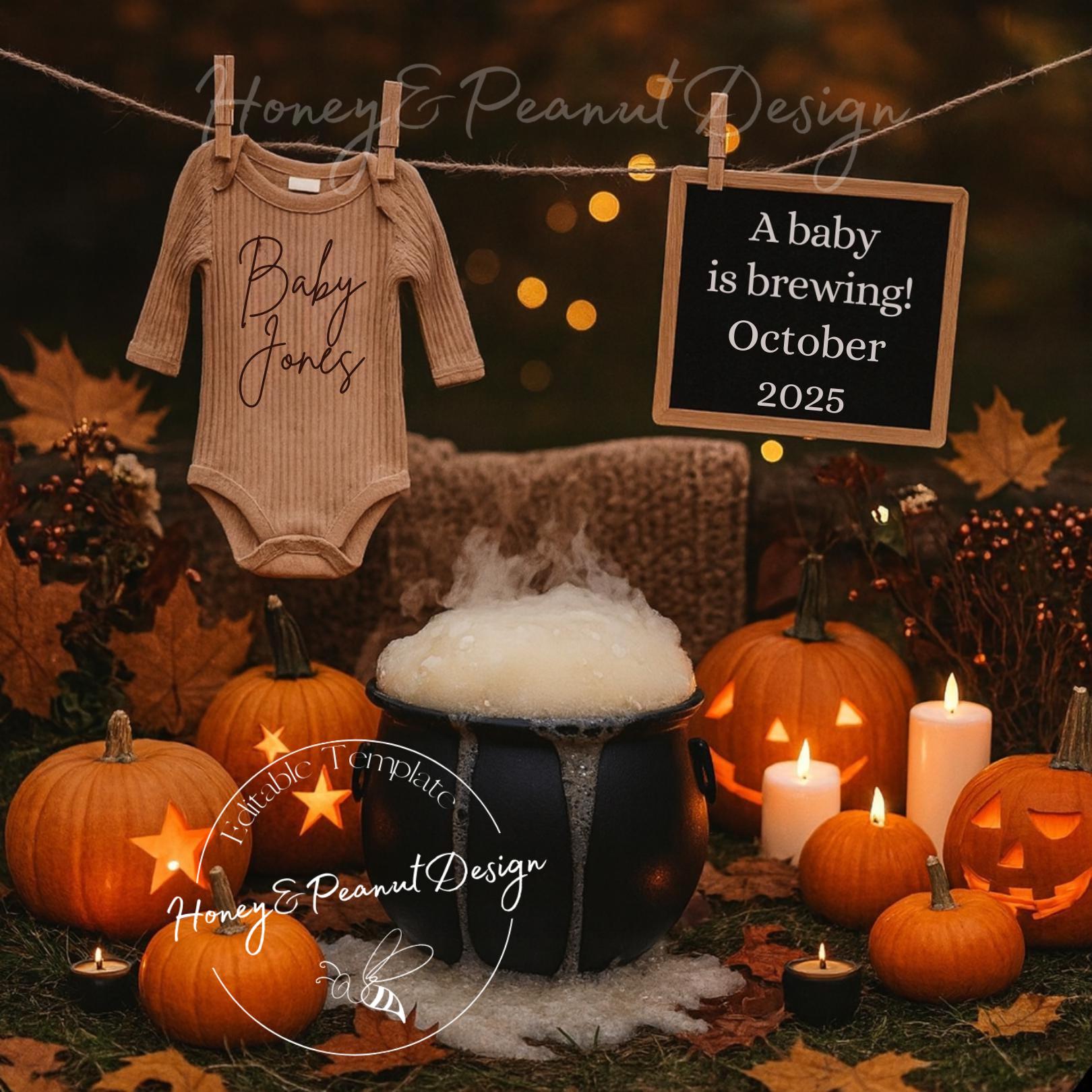 Share your exciting news with a touch of Halloween magic! Our Spooky Sweet Baby pregnancy announcement template features glowing pumpkins, a bubbling cauldron, cozy autumn lights, and the sweet message “A baby is brewing!”. This festive design is perfect for announcing your little pumpkin’s arrival during the fall season. 🍂✨