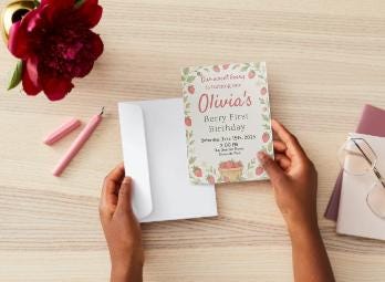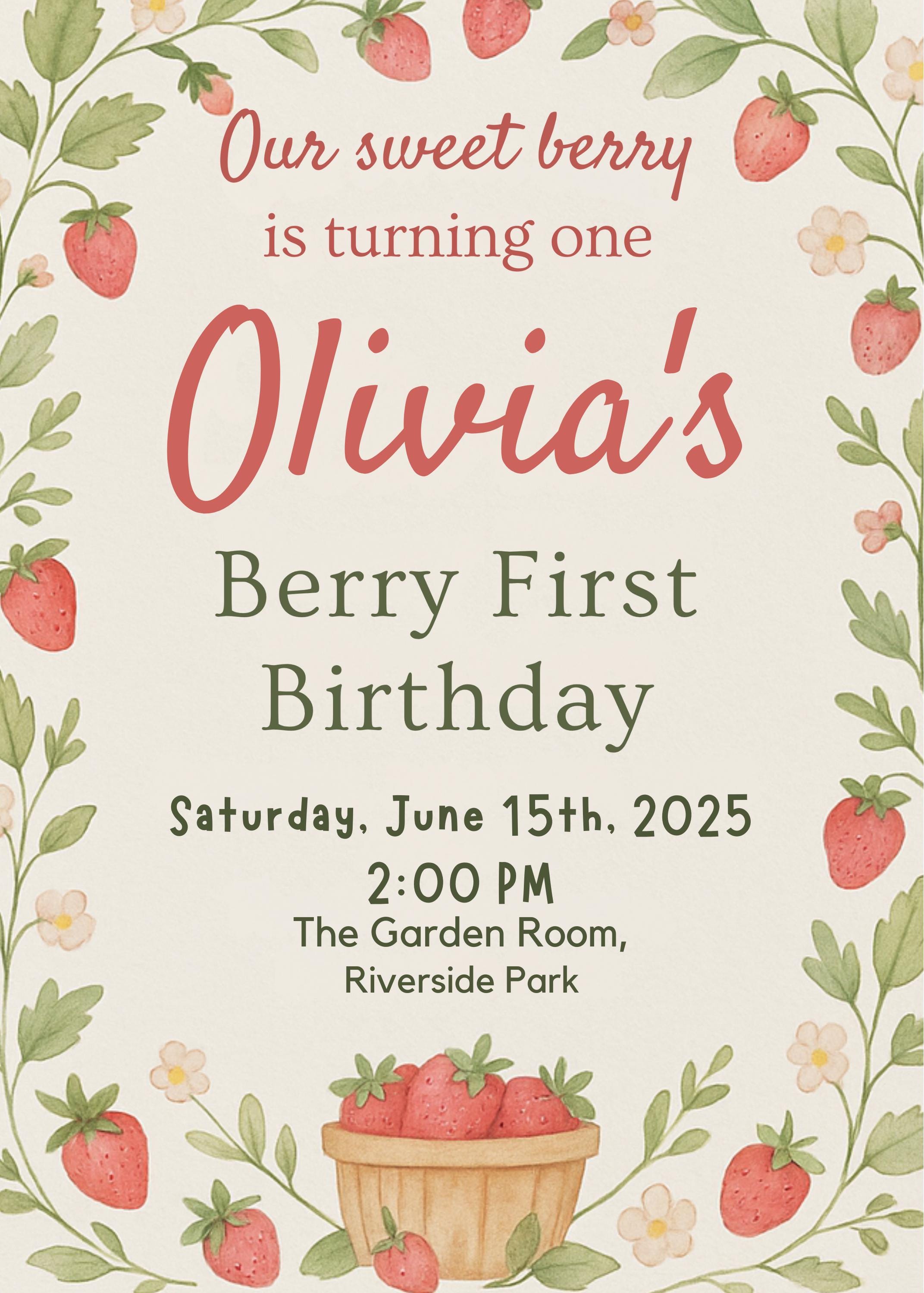 Celebrate your little one’s very first birthday in the sweetest way with this adorable “Berry First Birthday” invitation! Featuring watercolor strawberries, soft greenery, and playful fonts, this design is perfect for a spring or summer birthday party.