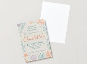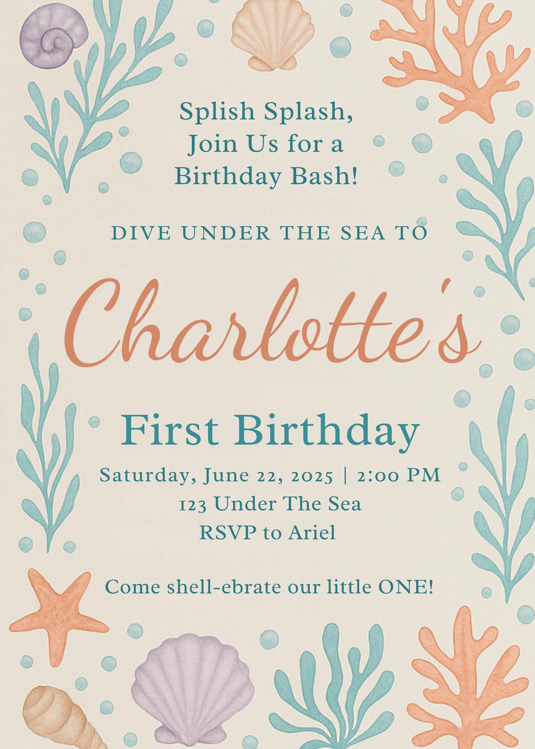 Make a splash with this adorable Under the Sea First Birthday Invitation! Featuring whimsical watercolor seashells, starfish, coral, and bubbles in soft pastel tones, this charming design is perfect for your little one’s special day.