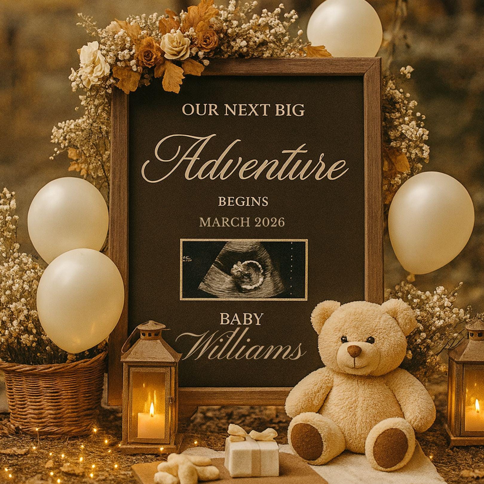 Celebrate your growing family with the cozy charm of autumn! The “Fall Adventure” Pregnancy Announcement Template is the sweetest way to share your exciting news with loved ones. Featuring glowing fairy lights, soft pumpkins, acorns, and a cuddly teddy bear, this rustic fall-inspired design creates a heartfelt and timeless reveal.