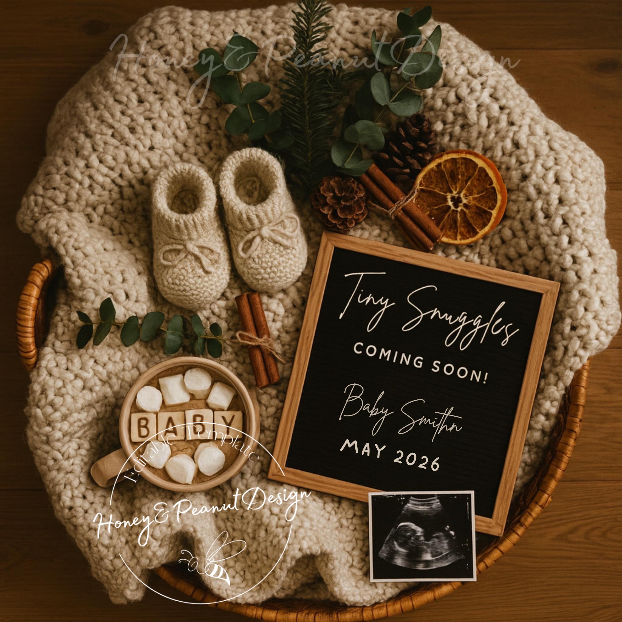Celebrate your growing family with our Tiny Snuggles pregnancy announcement — a warm, rustic, and heart-melting way to share your exciting news! Designed with soft knits, natural greenery, and neutral tones, this cozy flat-lay perfectly captures the feeling of winter comfort and new beginnings.
