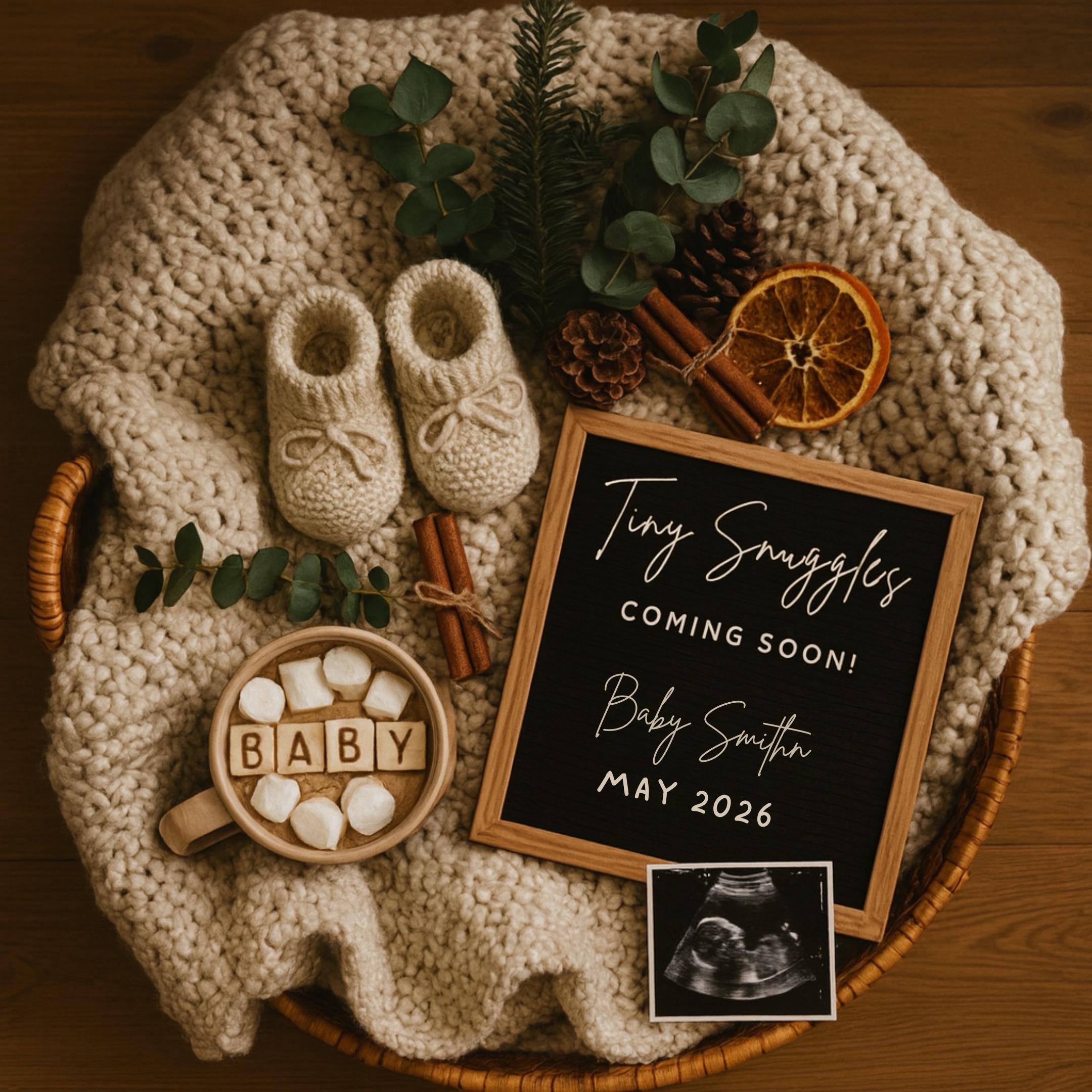Celebrate your growing family with our Tiny Snuggles pregnancy announcement — a warm, rustic, and heart-melting way to share your exciting news! Designed with soft knits, natural greenery, and neutral tones, this cozy flat-lay perfectly captures the feeling of winter comfort and new beginnings.