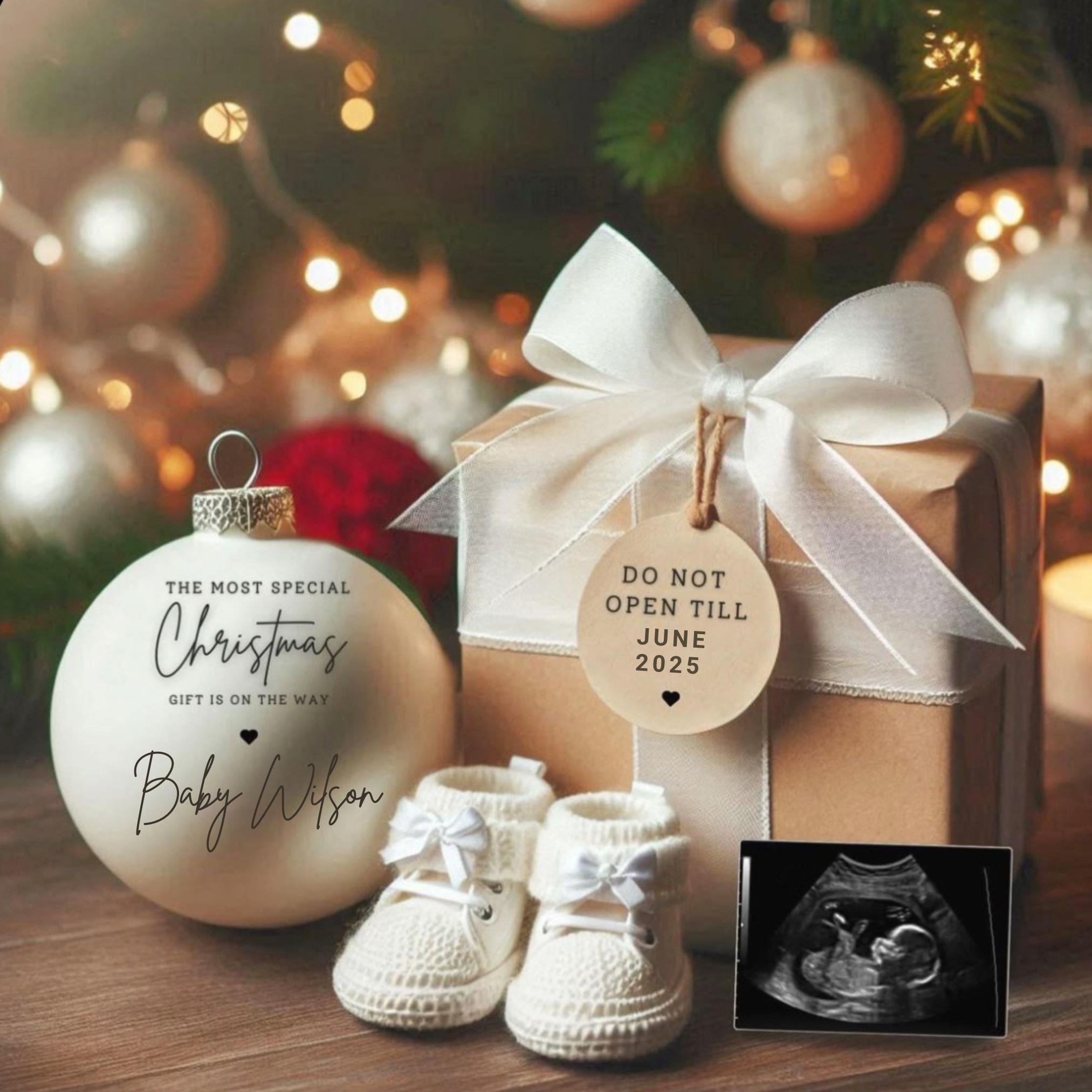 Share the joy of your growing family with this Christmas-themed pregnancy announcement template, Special Gift. Designed to capture the warmth and wonder of the season, this editable Canva template features a festive gift box, cozy baby booties, and a sweet holiday ornament — the perfect backdrop for revealing your little miracle.