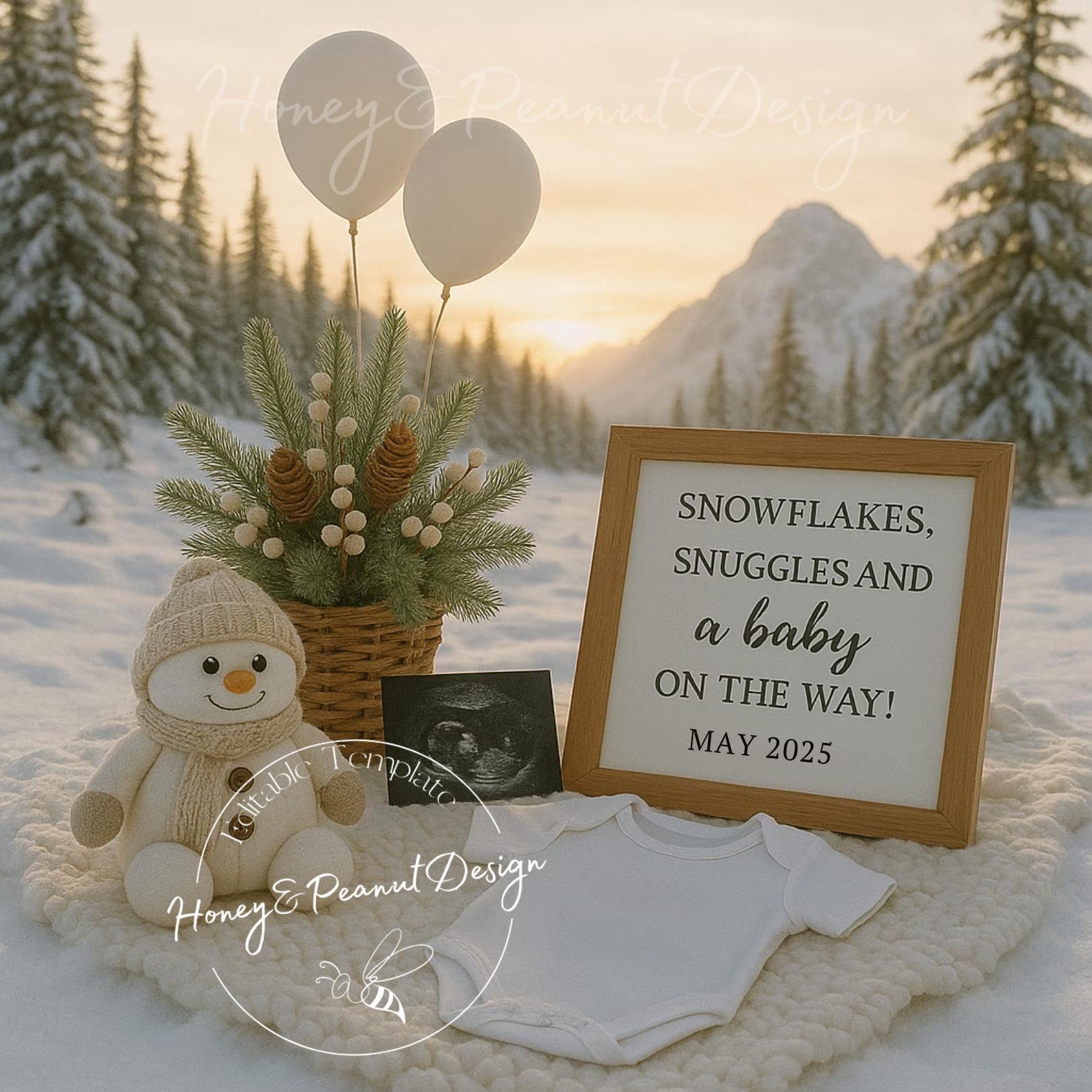 ❄️ Snowflakes and Snuggles – Winter Pregnancy Announcement Template ☕