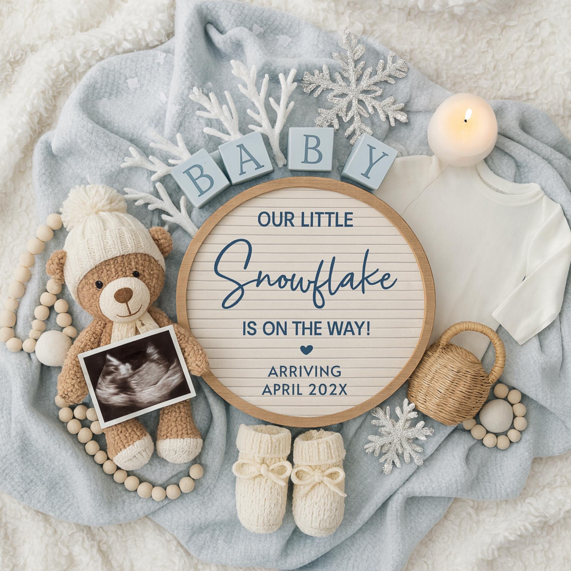 Featuring soft knits, gentle blue tones, and snowflake details, this design captures the magic of the season and the joy of your newest little miracle. Perfect for social media reveals, holiday pregnancy announcements, or printed keepsakes, this timeless layout makes sharing your special news simple and heartfelt.