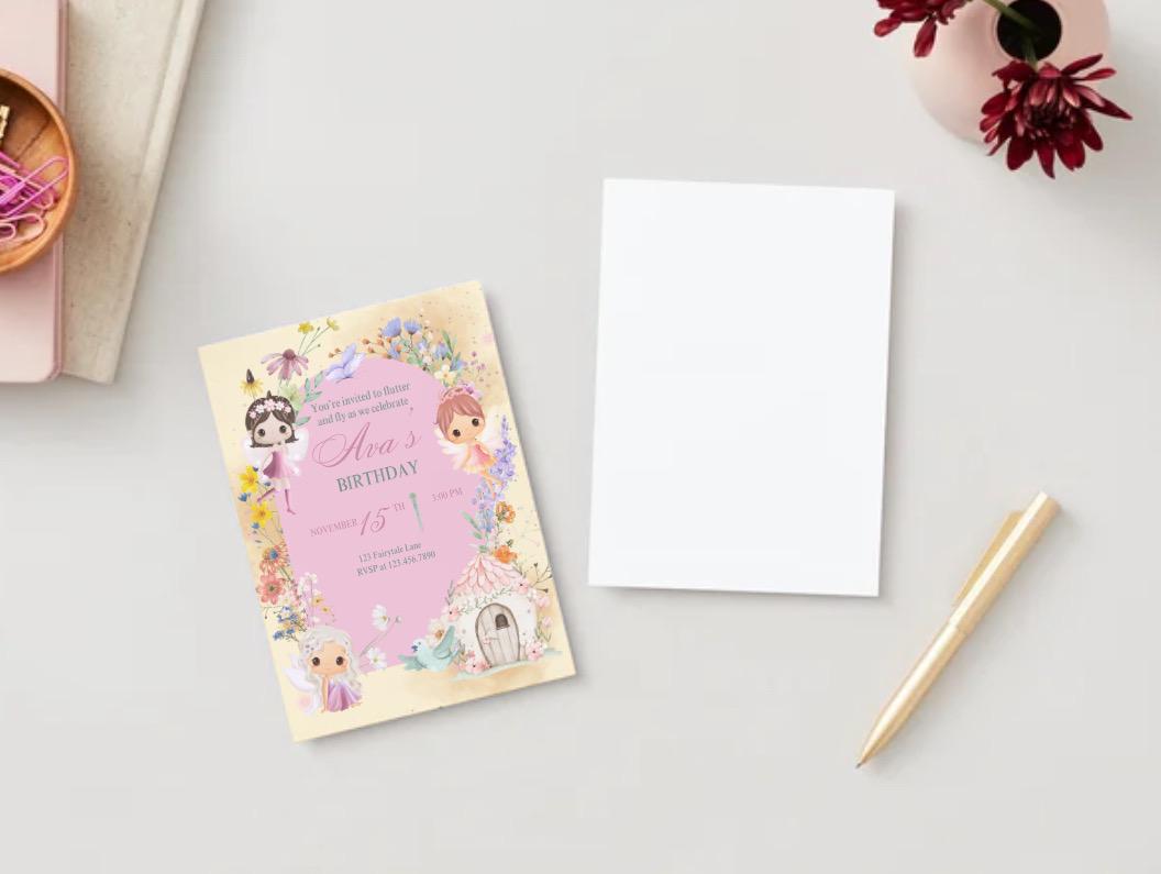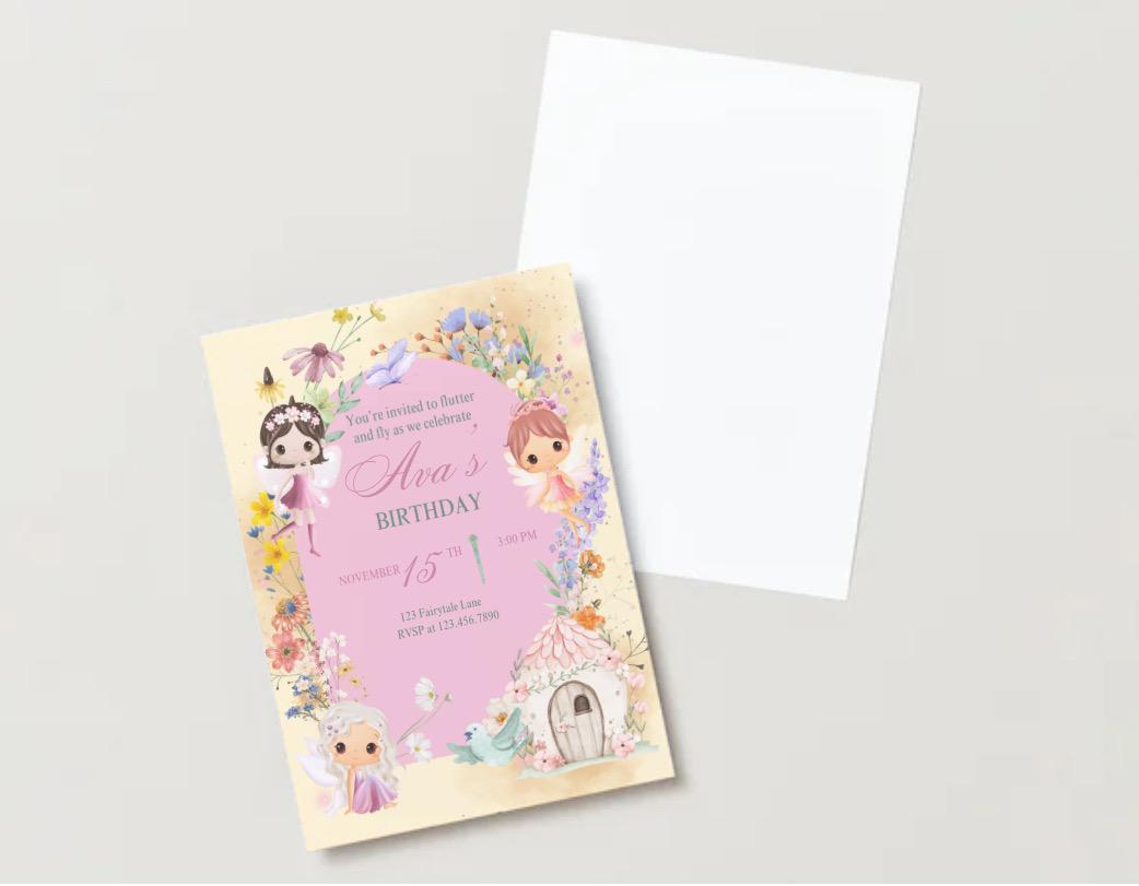 Invite your guests to flutter, sparkle, and celebrate with this enchanting Fairy Birthday Invitation! Perfect for your little one’s magical day, this printable invitation features whimsical fairies, pastel florals, and a charming cottage — straight out of a storybook.