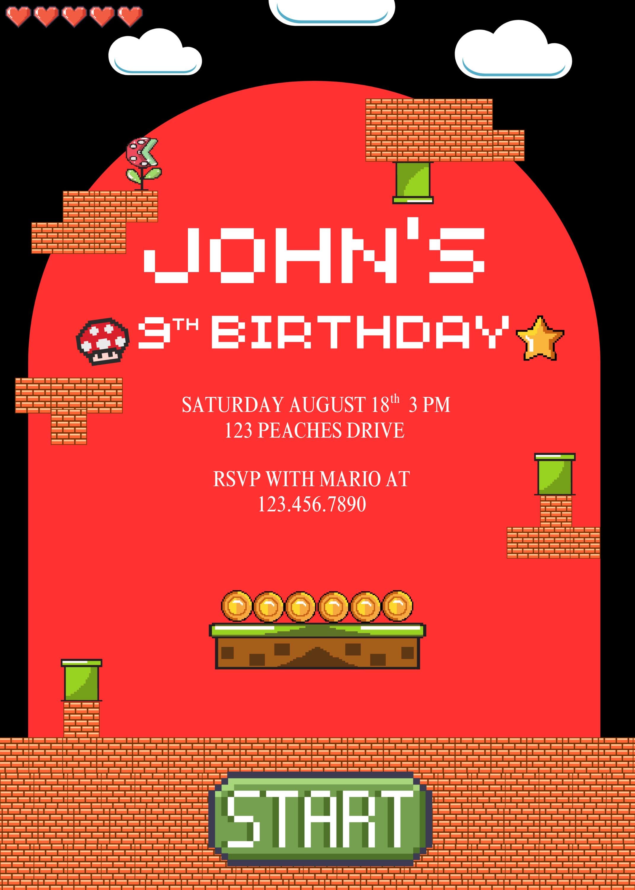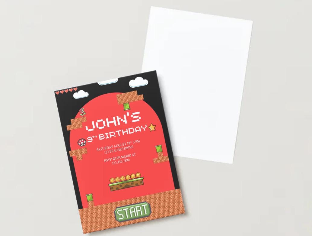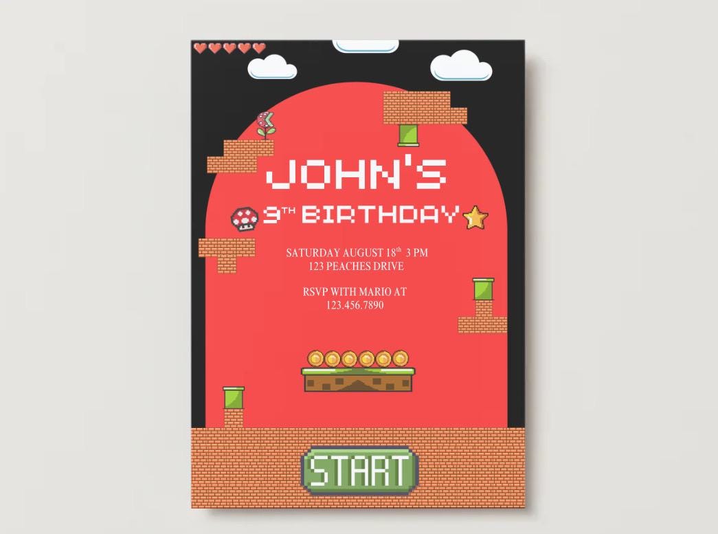 Whether you’re planning a Super Mario, arcade, or gaming-themed birthday, this bold and playful design will set the perfect tone for an action-packed event!