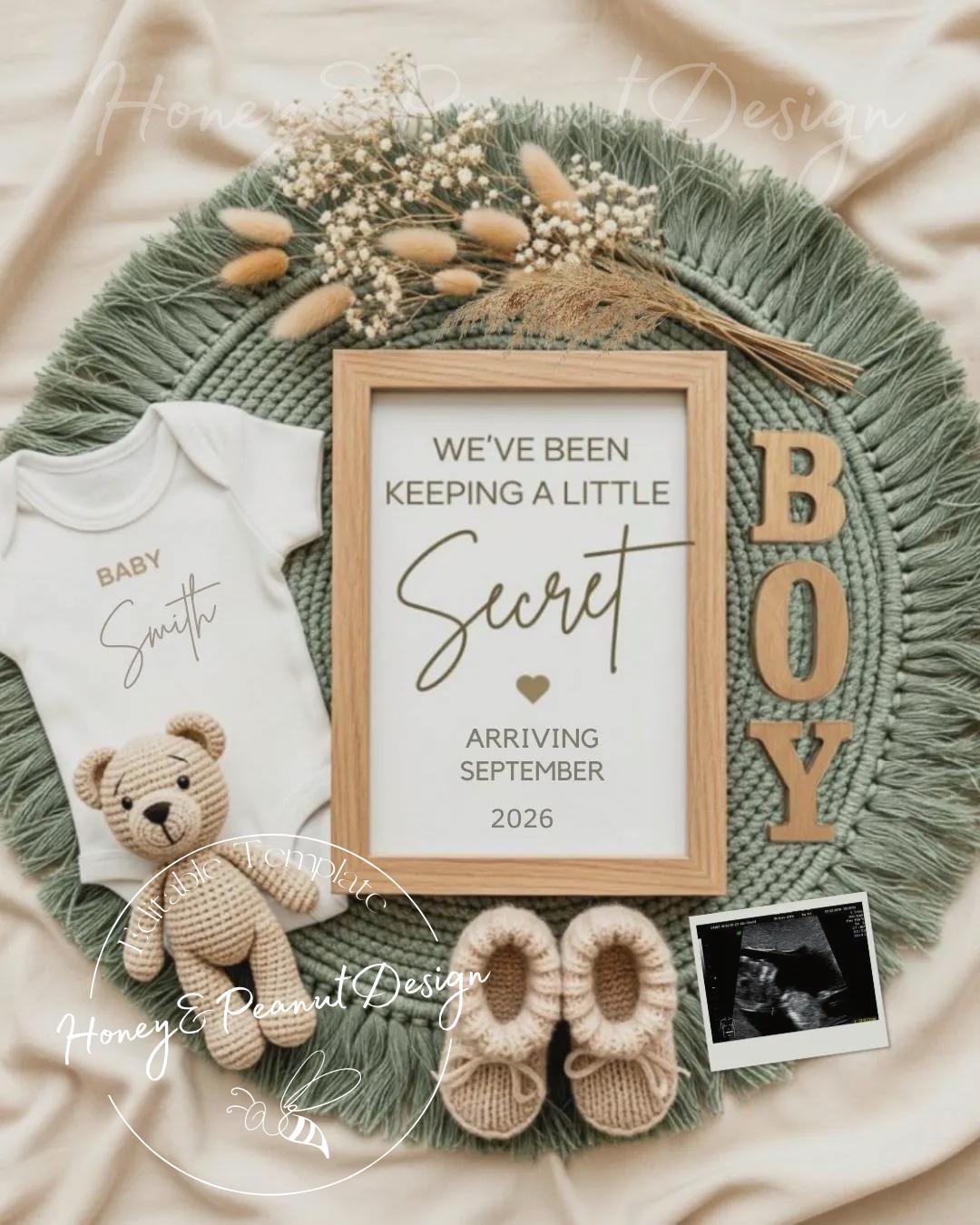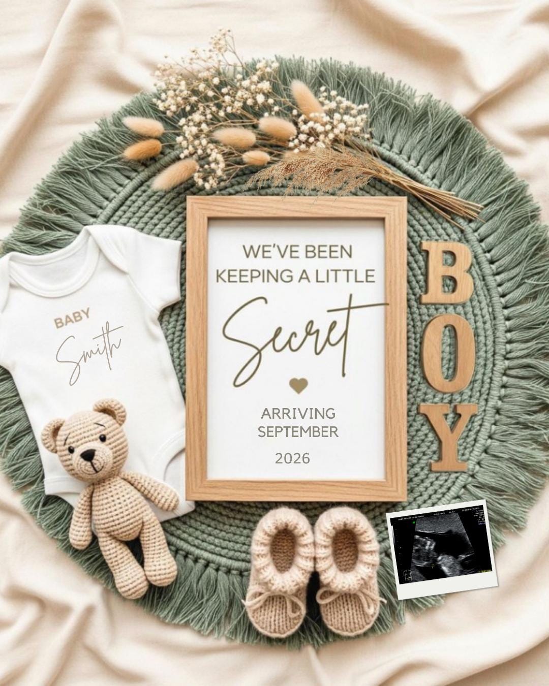🤍 Boho Pregnancy Announcement Template – Soft Sage Secret Reveal