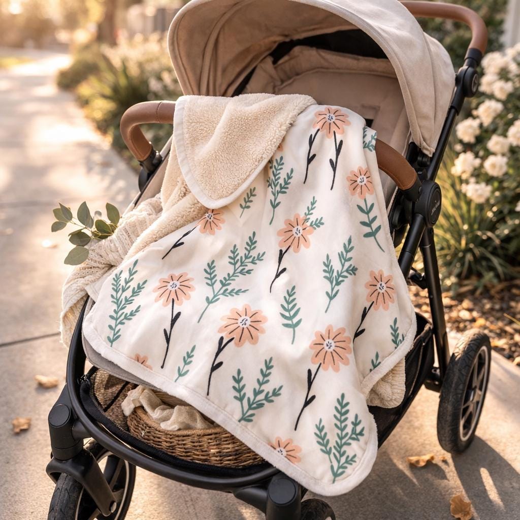 Wrap your little one in gentle calm. This plush lovey blanket pairs feather-soft fleece with hand-sewn edges for a cozy, lightweight comfort that’s easy for tiny hands to hold. The design—delicate peach flowers and soft green sprigs on a warm cream background—creates a soothing look that grows with the child: nap-time companion, stroller comfort, and a familiar piece to tuck into memory boxes. Durable polyester keeps shape and color, while edge-to-edge customization options let you add a name or date for a personal keepsake. Breathable and snuggle-ready, it settles into everyday rhythms — quiet mornings, birthday cuddles, and the soft hush of bedtime routines.