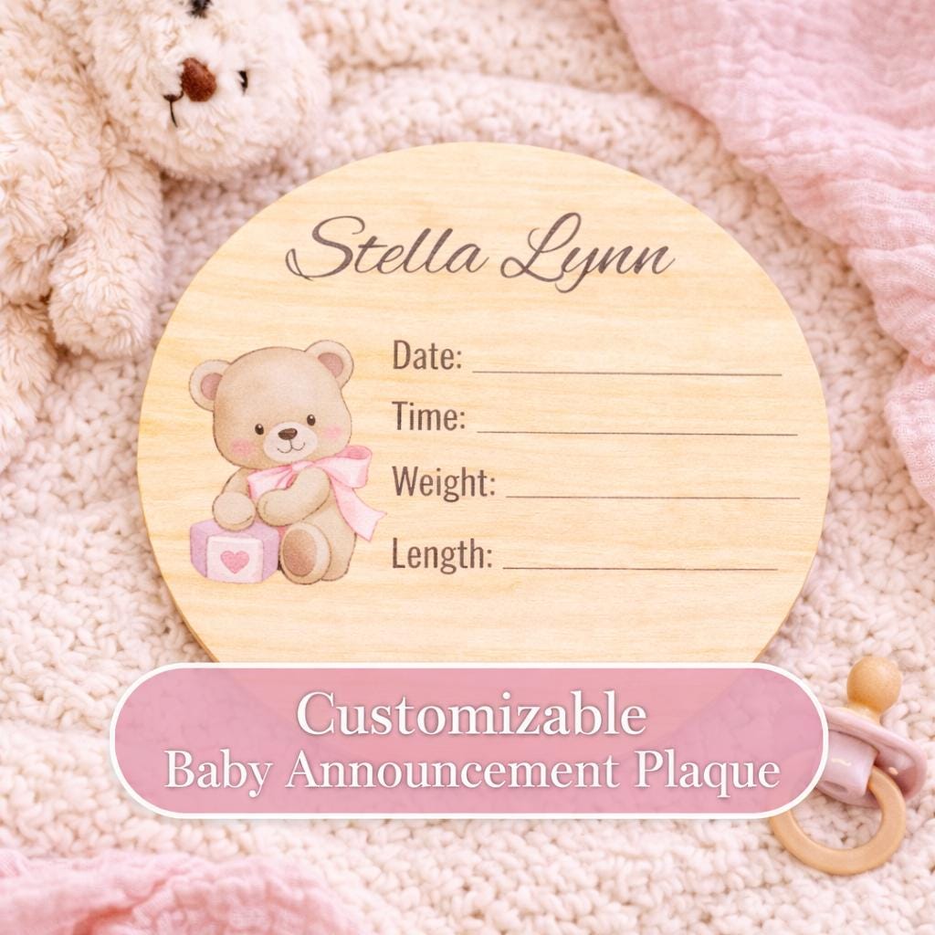 This round wooden birth announcement sign is crafted from natural Baltic birch and features a sweet watercolor teddy bear with soft pink accents, paired with elegant script for your baby’s name. Designed with space to record her birth date, time, weight, and length, it captures all the tiny details you’ll never want to forget.