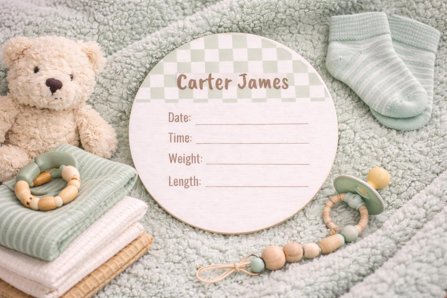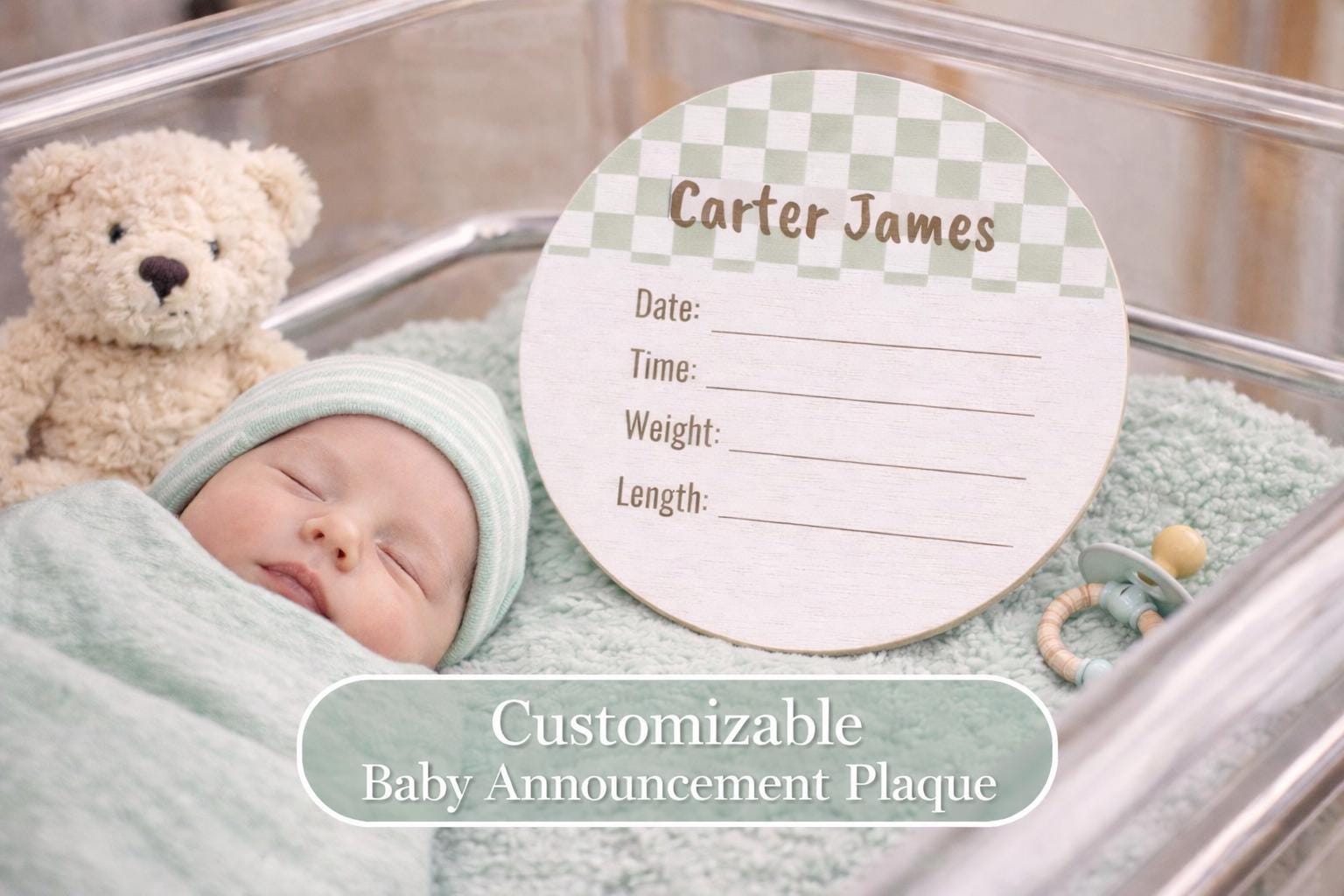 This round wooden birth announcement sign features a soft sage green checker pattern paired with warm, handwritten-style lettering for your baby’s name. Clean lines and a cozy neutral palette make it perfect for today’s modern nurseries while still feeling timeless and heartfelt.