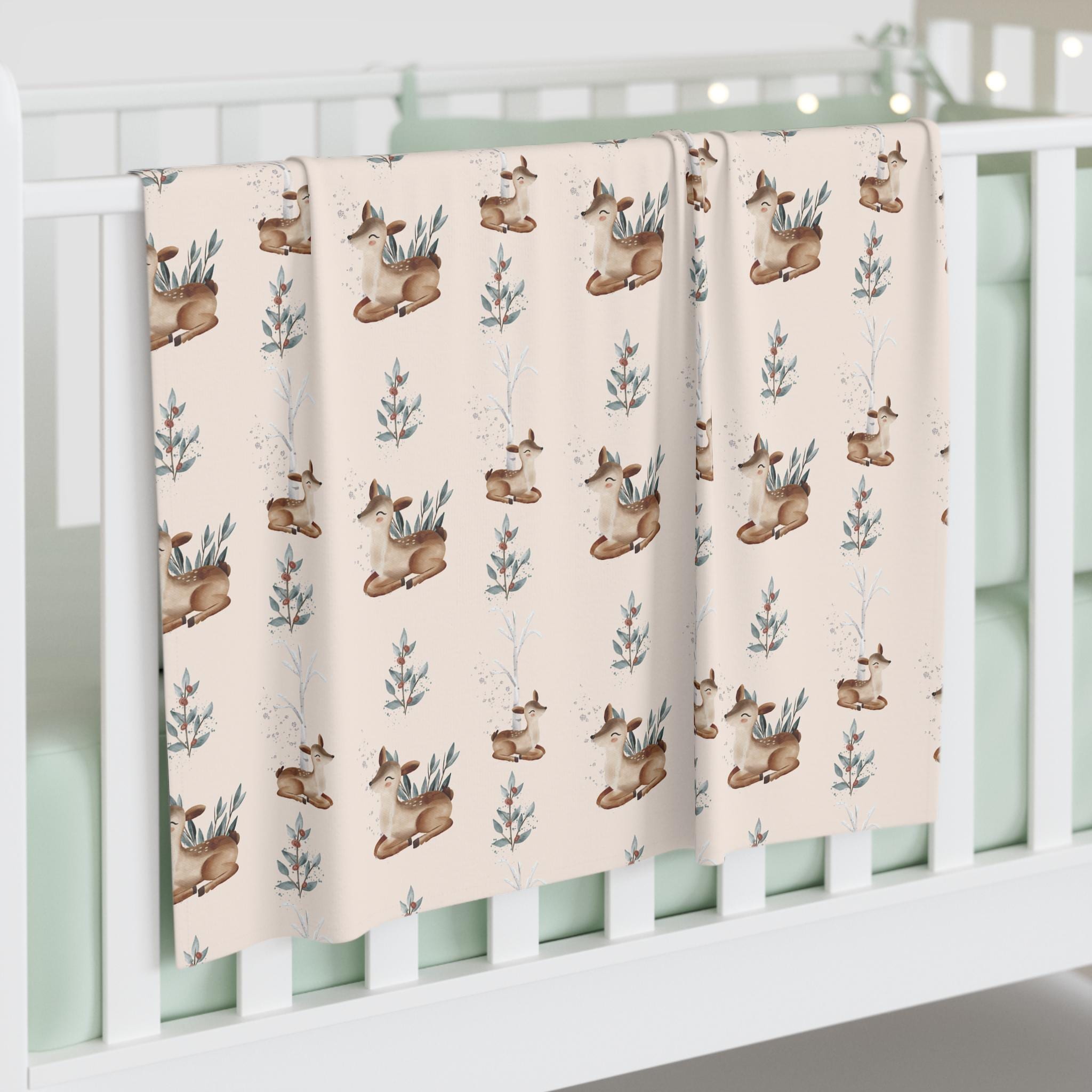 Delicate watercolor fawns wander through soft greenery on a warm neutral blush background, creating a gentle, nature-inspired print that feels calm, timeless, and effortlessly cozy. It’s the kind of piece that looks just as beautiful draped over a crib rail as it does wrapped around your newest little love.