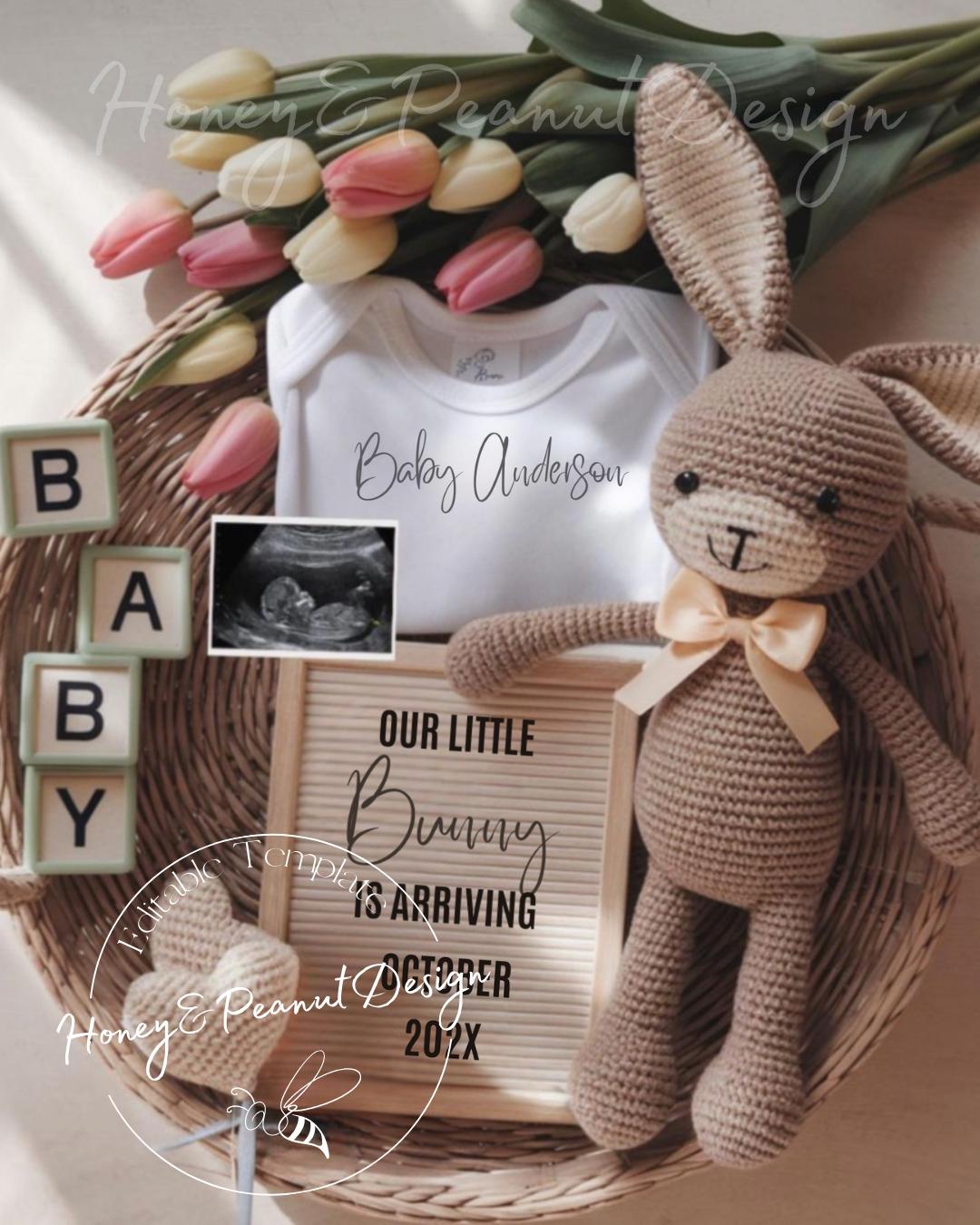 Share your joyful news with Some Bunny Is Coming, a soft and playful pregnancy announcement inspired by cozy textures, sweet bunny details, and gentle spring florals.