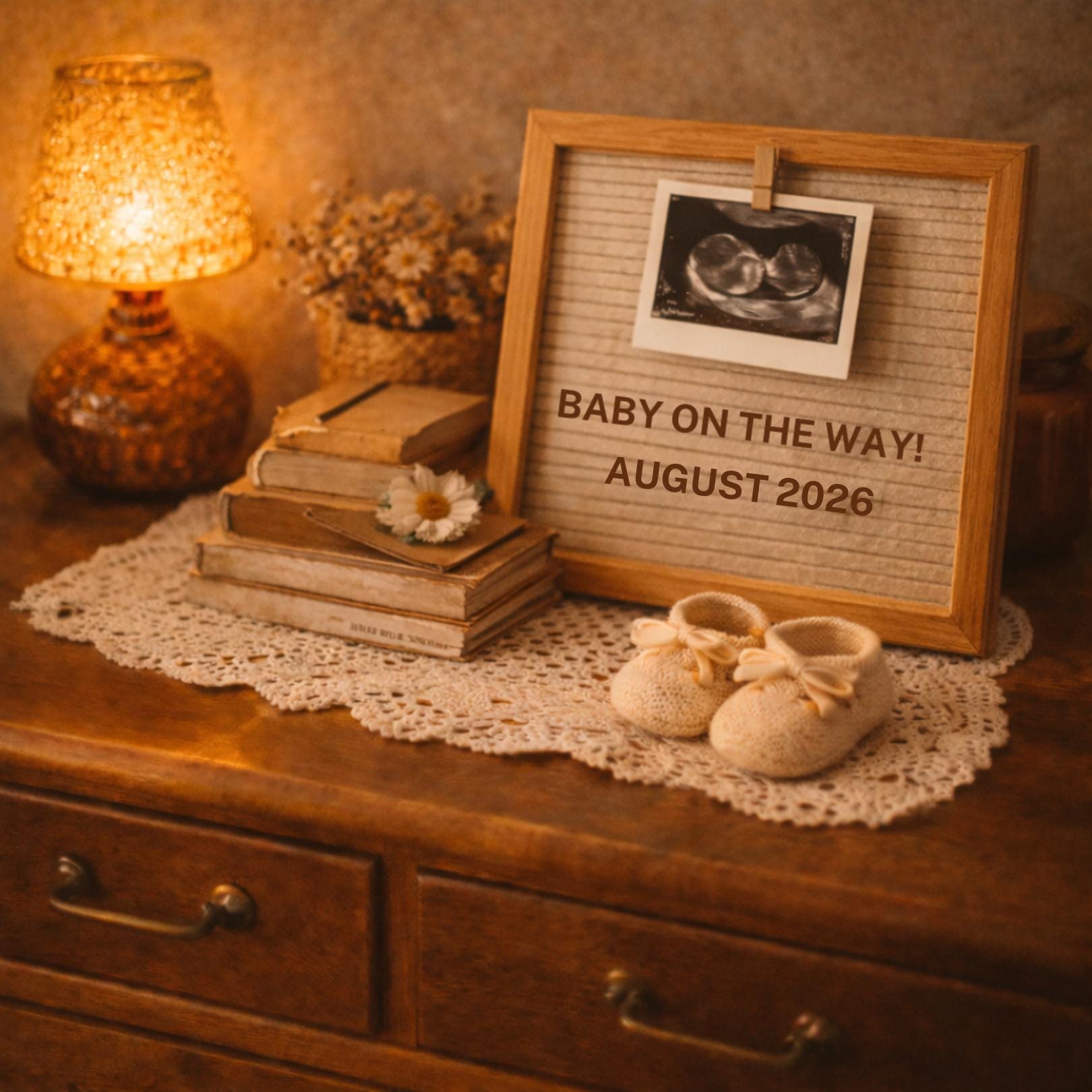 Announce your sweetest news with timeless charm. Vintage Keepsake Baby captures the warmth of golden lamplight, heirloom books, delicate lace, and soft baby shoes — creating a nostalgic, keepsake-inspired moment you’ll treasure forever.