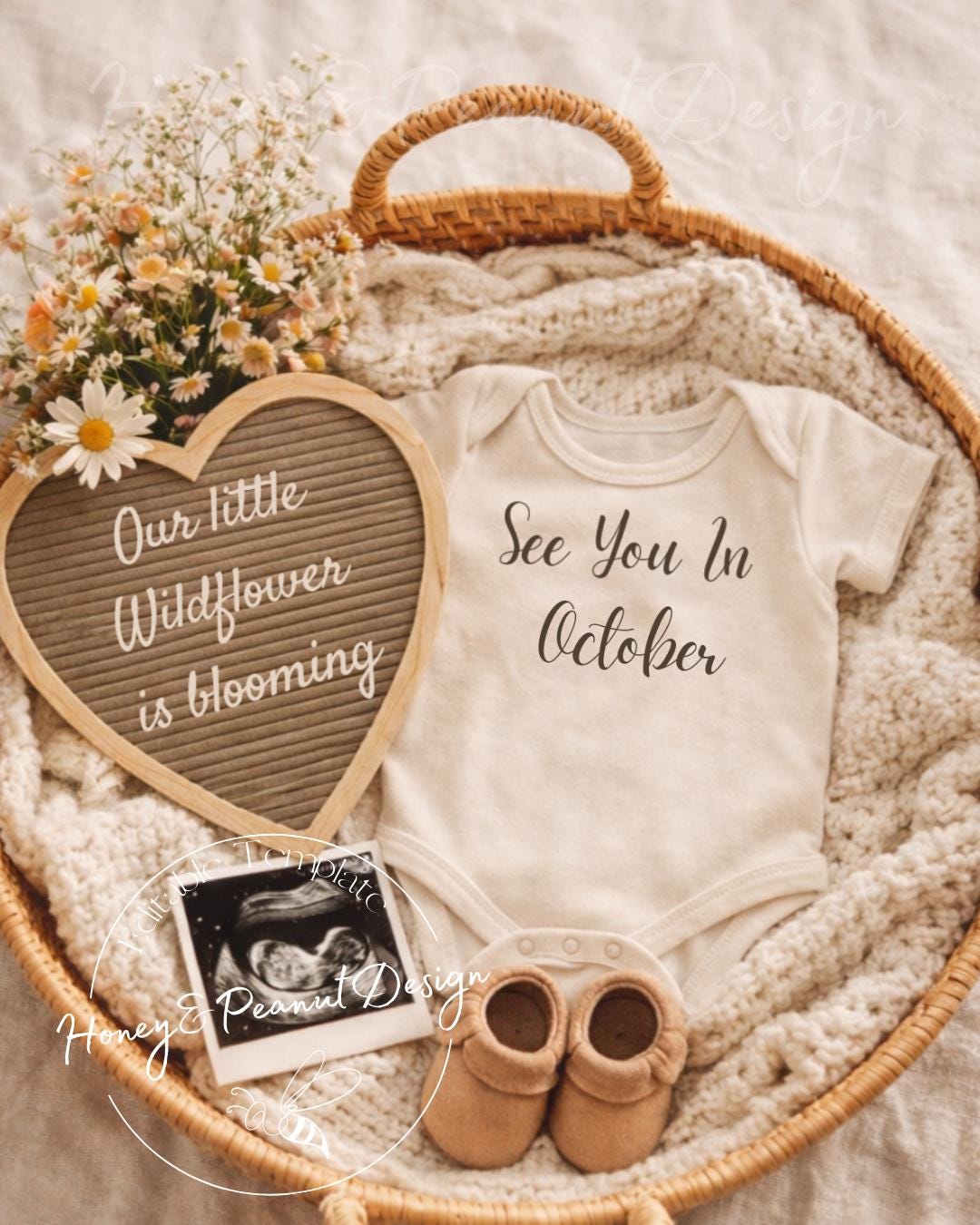 This digital pregnancy announcement blends earthy elegance with heartfelt simplicity. The neutral tones and floral details create a timeless, cozy setting — perfect for announcing your October baby or customizing for any due date.