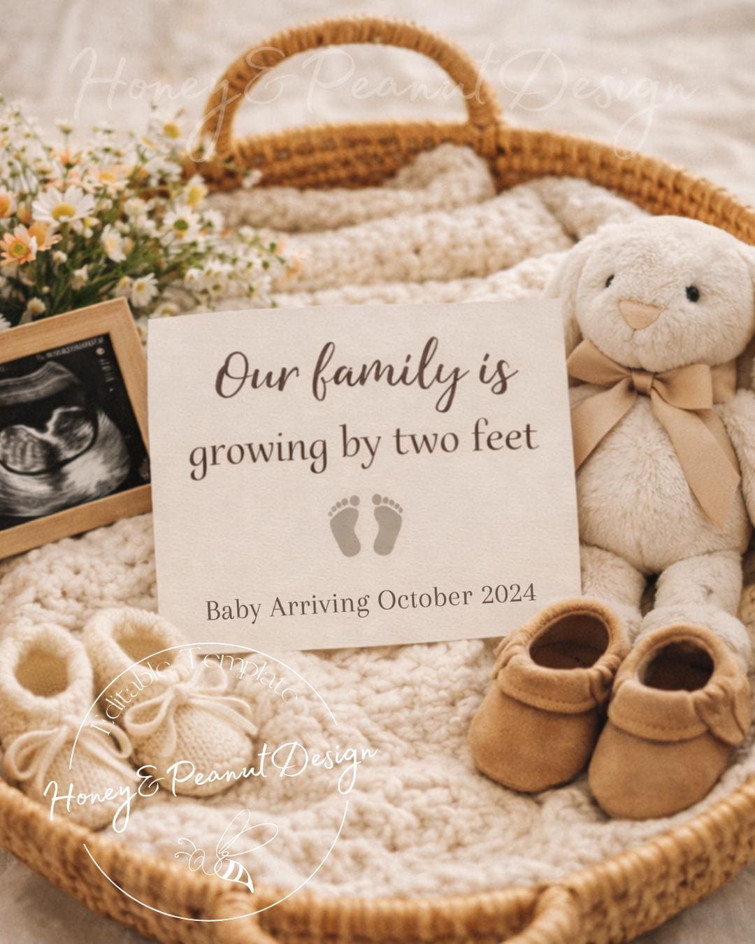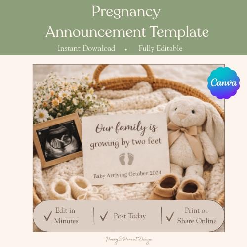 Perfect for social media reveals, digital keepsakes, or printed announcements, this editable template allows you to personalize names, due dates, and special details to make it uniquely yours. Whether you're announcing your first little love or adding another set of tiny toes to your family, this design offers a gentle and meaningful way to say, “Our family is growing.”