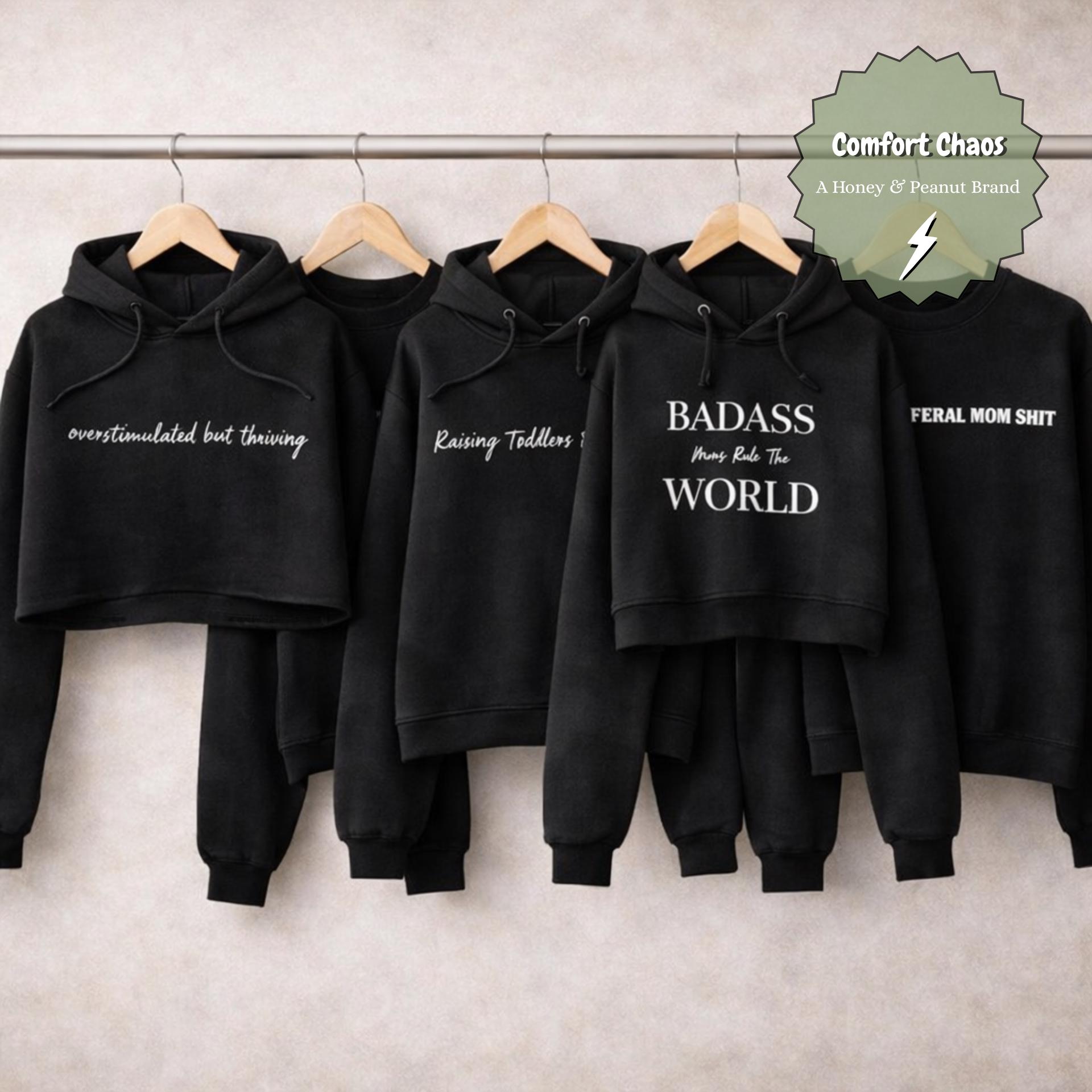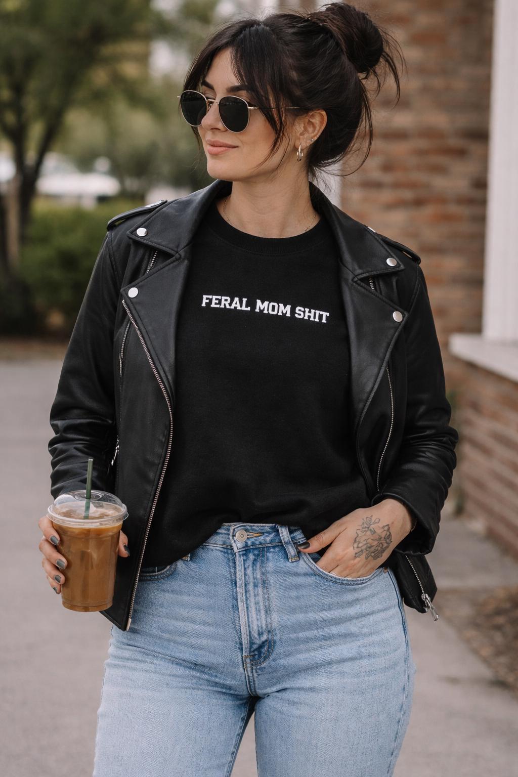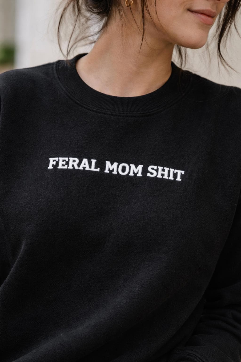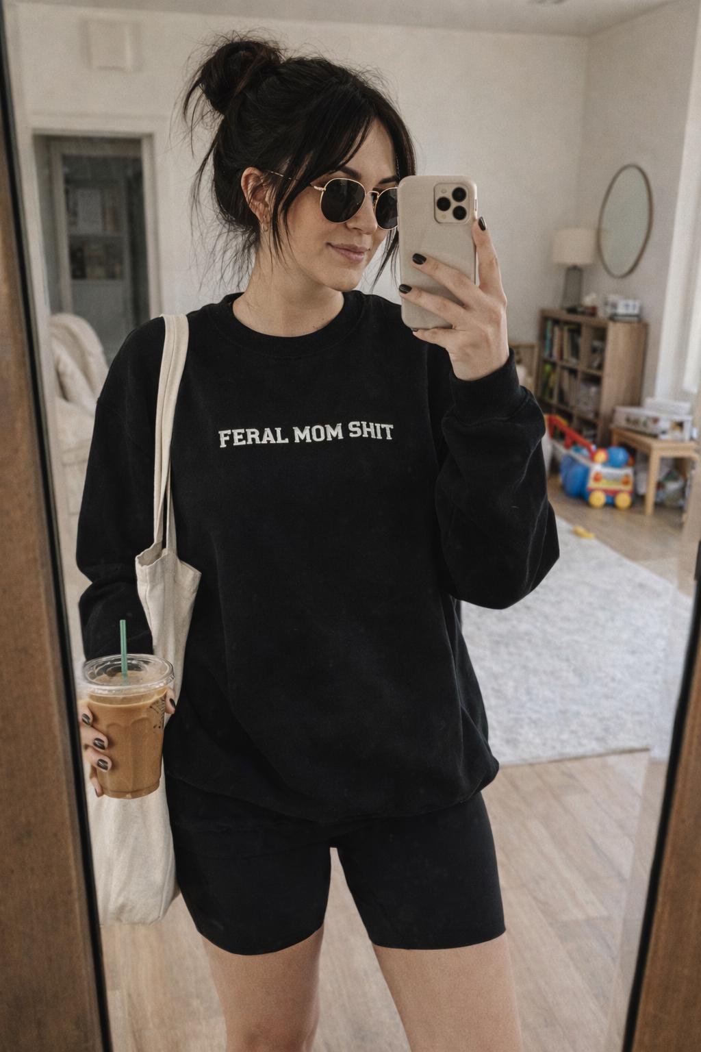 Featuring a bold “feral mom shit” embroidered design across the chest, this sweatshirt is the perfect mix of cozy + edgy. Throw it on with jeans, biker shorts, or leggings and you’ve instantly got that effortless, cool mom vibe.