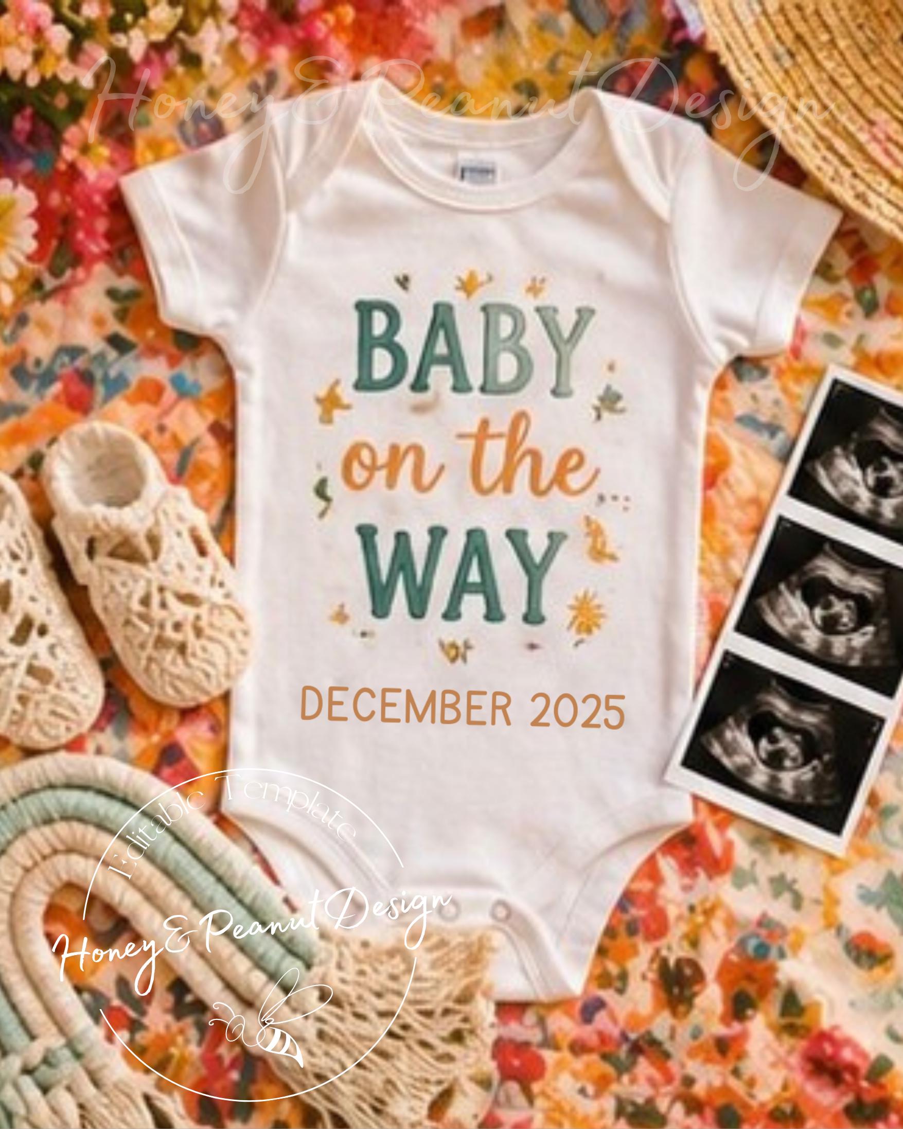 Share your exciting news with this vibrant and joyful pregnancy announcement, designed with a beautiful boho-inspired color palette. Featuring a playful “Baby On The Way” design on a neutral onesie, this template brings warmth, personality, and a cheerful summer feel to your special moment.