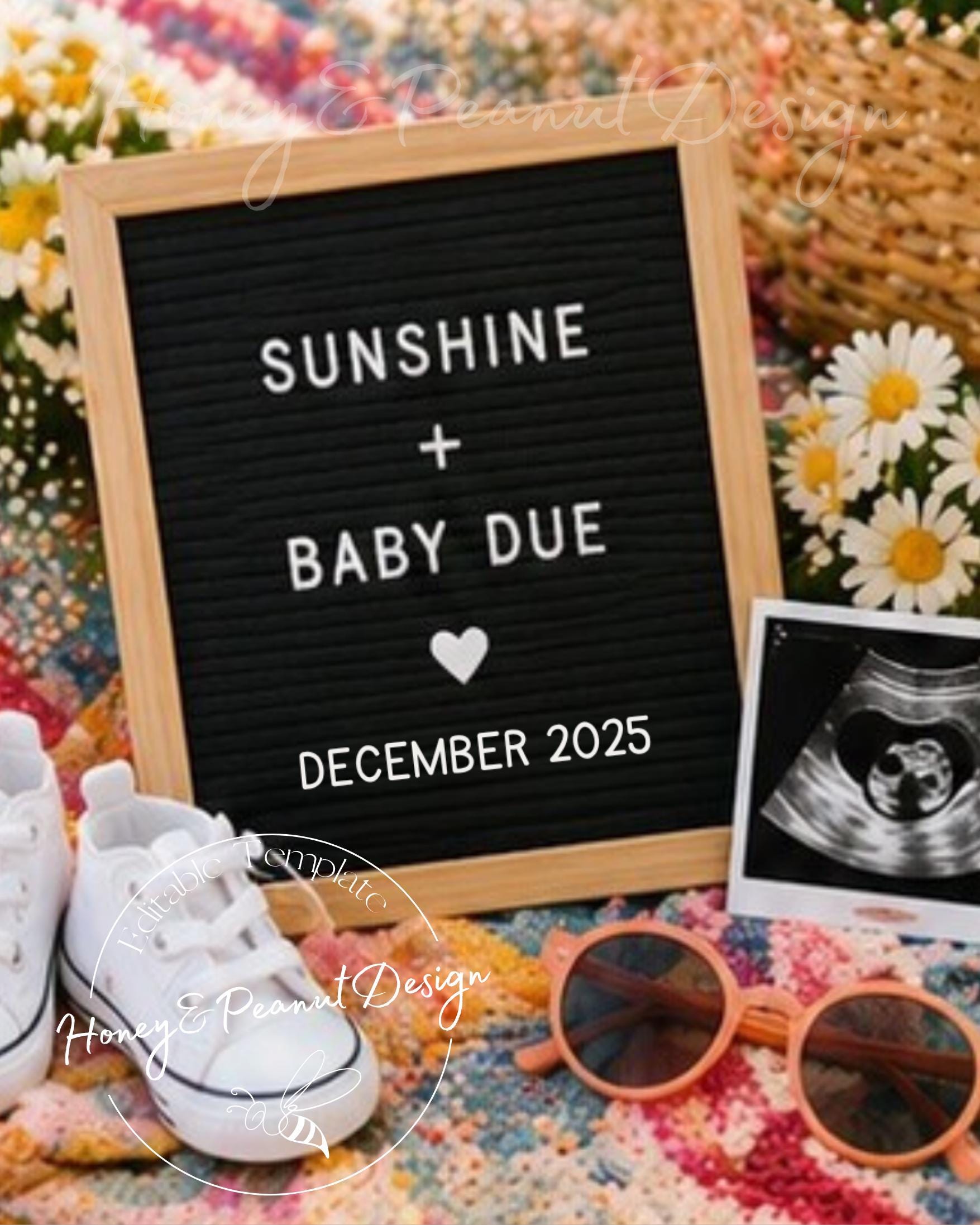Sunshine & Baby Due Pregnancy Announcement Template | Editable Canva Summer Baby Reveal | Letter Board Floral Announcement