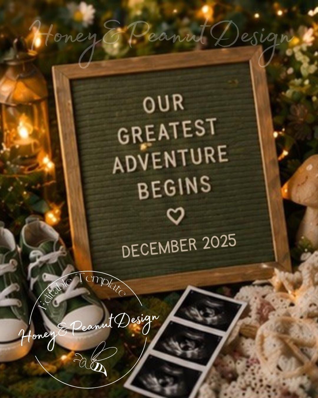 Announce your exciting news with this cozy and magical woodland-inspired pregnancy announcement. Featuring a rich forest green letter board surrounded by warm lights, natural textures, and earthy details, this “Our Greatest Adventure Begins” design creates a beautifully intimate and storybook-like moment.