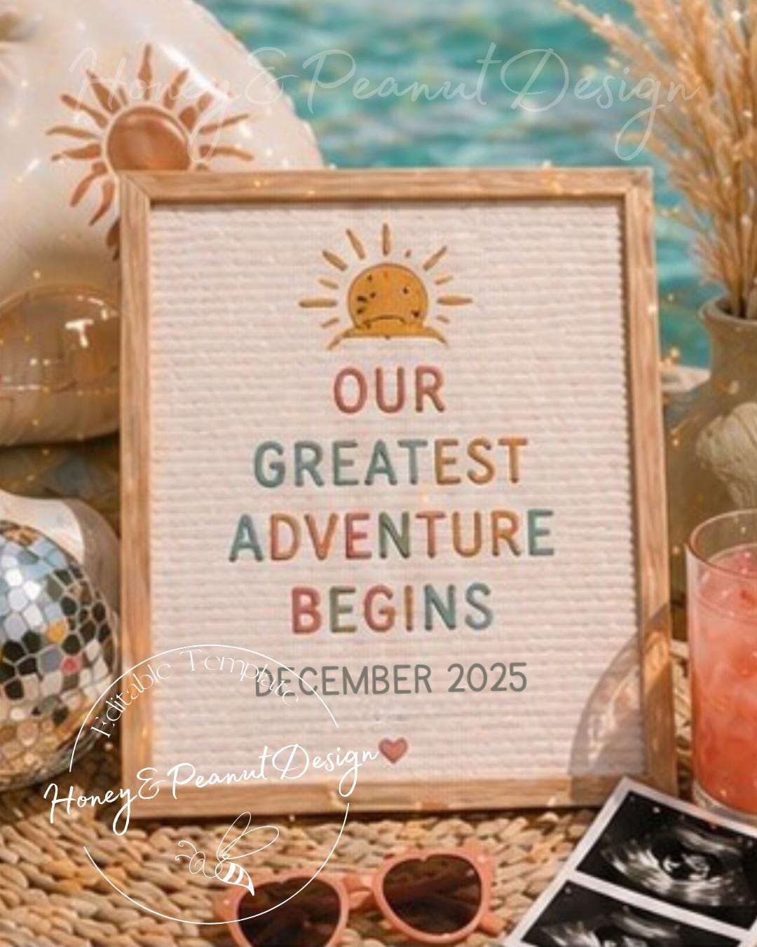 Our Greatest Adventure Begins Pregnancy Announcement Template | Editable Canva Summer Baby Reveal | Boho Sunset Design